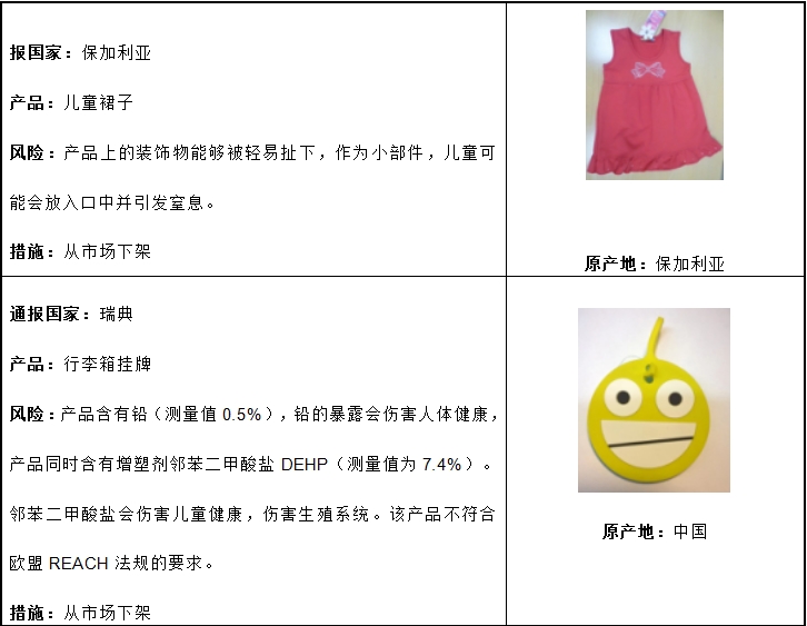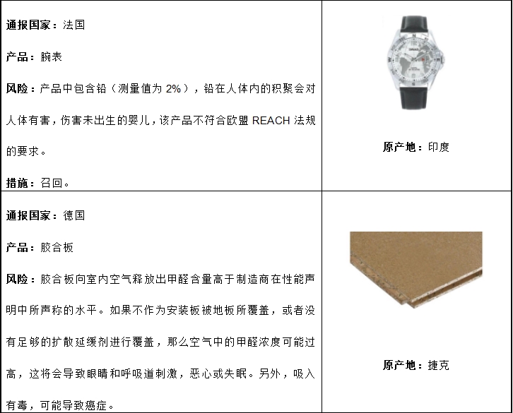 歐盟非食品快速預(yù)警系統(tǒng)(The Rapid Alert System forNon-Food Products, RAPEX)旨在歐盟內(nèi)部快速交換、傳遞產(chǎn)品信息,每周均會(huì)于其官網(wǎng)公布各歐盟不合規(guī)的產(chǎn)品及其處理方式。具體如下列表格所示: